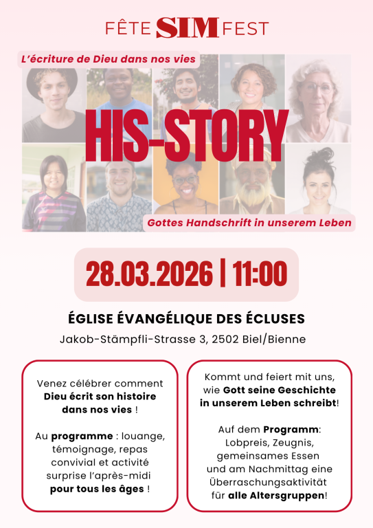 Rejoignez-nous le 28 mars 2026 à partir de 11h à l’Église évangélique des Écluses, Rue Jakob-Stämpfli 3, 2502 Bienne, pour une journée pleine de rencontres, de partage et de surprises !